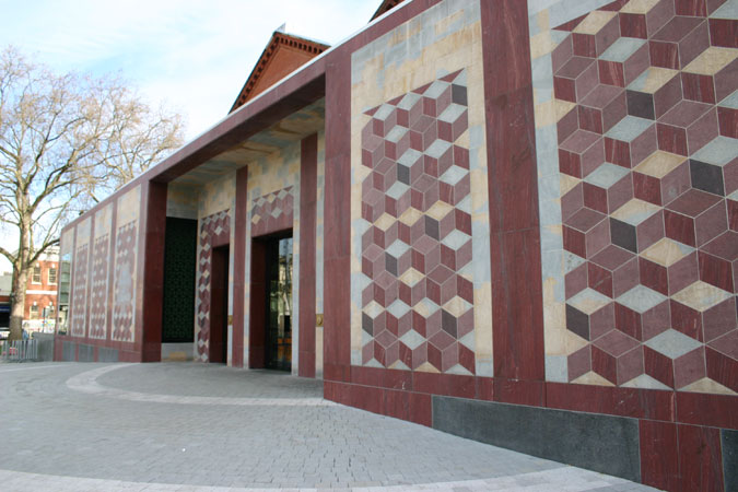 Cut red porphyry stone depicts a colonnade, while pale limestone and quartzite are used to infill the gaps. This dialectic between planarity and perceived depth extends through the use of glazing set flush with the stone in three of the bays, while the remainder contains panels of a repetitive geometric motif.