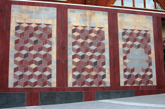 The museum was originally constructed in 1857 under the instruction of Prince Albert. In the early 50's a series of photographs were taken depicting children skipping and playing hopscotch on the streets of Bethnal Green. These powerful images illustrated unity found though play amid poverty - this image today was incorporated in Caruso's excellent design.