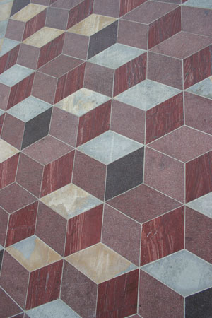 Cut red porphyry stone depicts a colonnade, while pale limestone and quartzite are used to infill the gaps. This dialectic between planarity and perceived depth extends through the use of glazing set flush with the stone in three of the bays, while the remainder contains panels of a repetitive geometric motif.